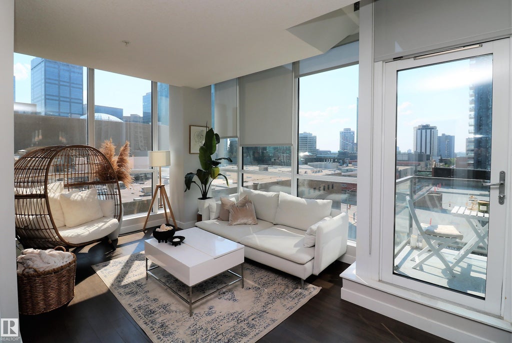 Come home to the 8th floor of the prestigious Ultima Tower! This contemporary 2-bed 2-bath corner suite offers sweeping views of downtown. Located in Ice District just steps away from Rogers Place. Open floor plan with loads of natural light from south and east facing floor to ceiling windows. 9’ ceilings, neutral paint palette and luxury vinyl plank blanket the floor. The spacious kitchen has been carefully crafted with granite countertops, stainless steel appliance package and dark maple cabinets. Work from home, tan on the south facing deck, this condo is fantastic! With 2 spacious bedrooms, including the primary bedroom that boasts a large walk-in closet and private ensuite bath. The building has an amazing lifestyle amenities package that includes gym, hot tub, huge patio, bbq area, indoor kitchen space and sitting area. All of this, plus titled underground heated parking, all located within walking distance to Rogers Place, MacEwan University, Jasper Avenue, and so many eateries!